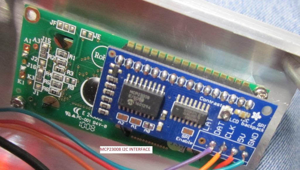 The display used here was a standard 2 x16 LCD module with an I2C adapter PCB fitted on the back. Adapter came from eBay.