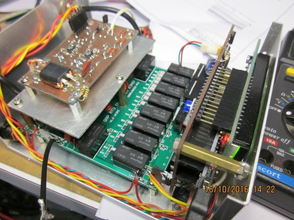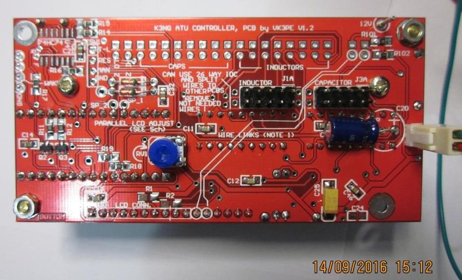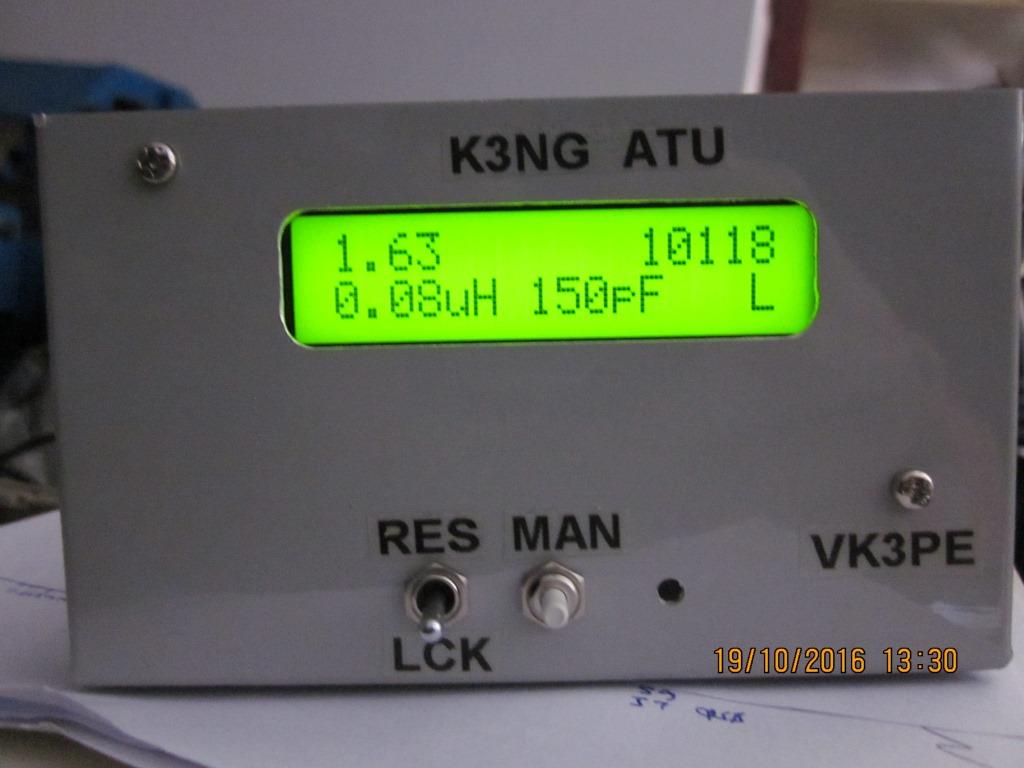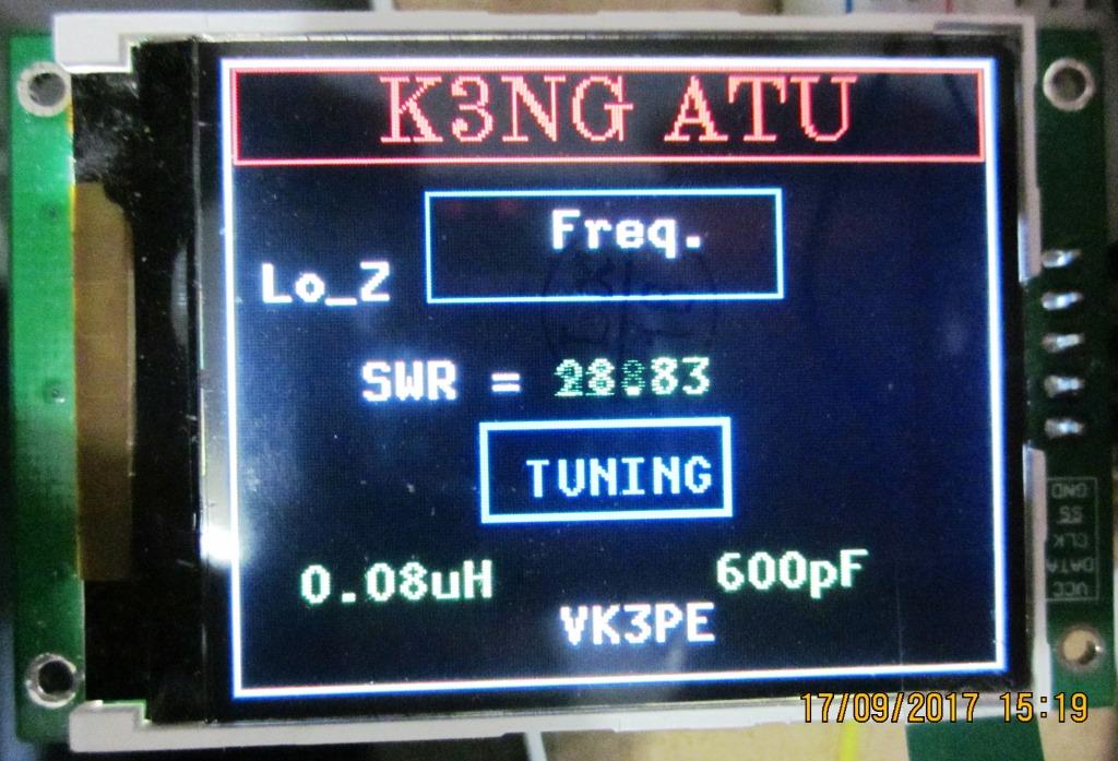 These are K3NG's prototype and his pictures, borrowed from the WWW. I hope he doesn't mind. There is a Yahoo group "Radioartisan" that covers his various projects. I am a member of that group. The display shows final SWR (top left) the inductor and capacitor values and the approx. frequency. (The ATU remembers past tune results)