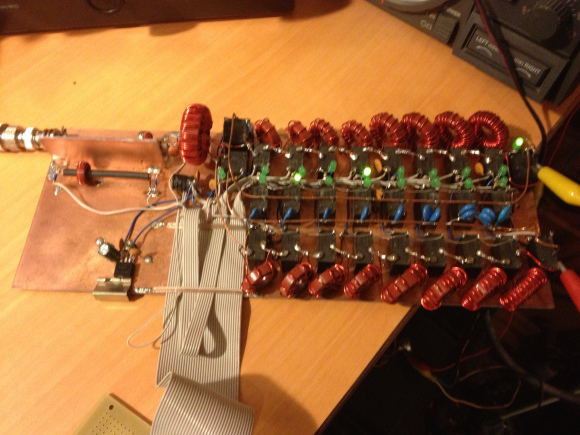 The inductor and capacitor boards are both similar to the one shown above. They are 50x100mm PCB's. In order to get the required eight inductors (or capacitors) identical boards (apart from values) are connected together using ribbon cable for the control lines and thick wire or copper strap, for the RF connections. Larger toroids and relays than the QRP version are used.