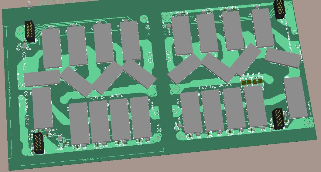 I found that the most economical size for low numbers of PCB's from vendors is 50 x 100mm in size so I used this size for all of the PCB's. (Except QRP version below) This created a problem though as there are many (20) large relays used in this project which simply will not fit on a single board! So, I decided to split the boards into two types for the capacitors and inductor mounting along with their associated relays. Even that was a problem as I found I could fit no more than four relays on a 50x100mm board for the inductors , and six for the capacitor bank. Some 'smart' thinking was needed. I decided to make the two main boards (caps and inductors) so they could be cascaded together. Sounds simple, but actually not so. More on this later.