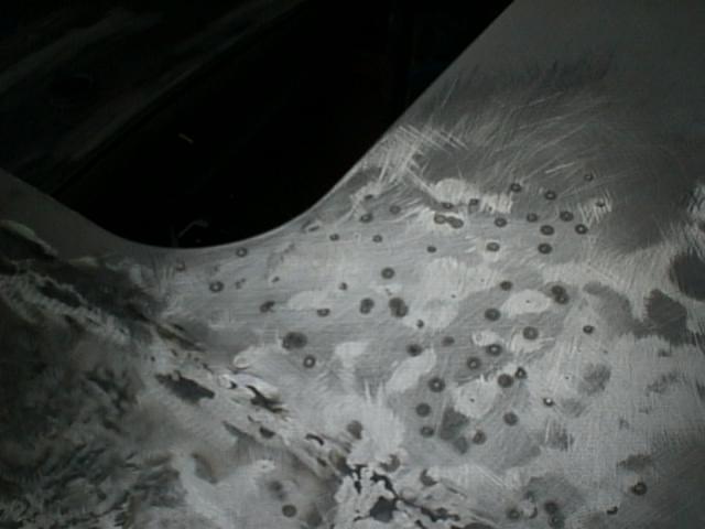 The College teacher showed me a spot welder gun that can be used to pull up dents. The result is shown here, almost perfect now. The black spots are where the gun attaches itself to the roof to pull up a small area at a time. The light areas are where a file has been skimmed over the top to check progress. A very light coat of filler is all that is now required.