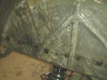 The rear section of the body was attached to the floor frame by drilling holes in the wheel well area and MIG welding (dark spots in picture) through to the floor frame.