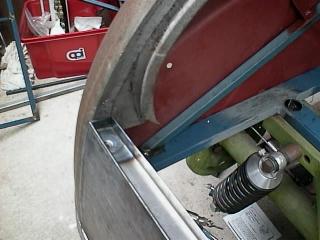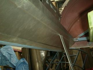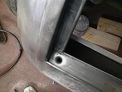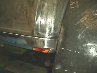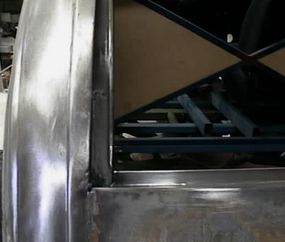 Here is a view from under the side of the car, where the panel shown above has been fitted onto place. The bottom left edge is to be welded from the inside onto the blinker panel and the top right side now forms a rib across the car for the rear floor panel to sit on.