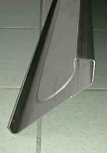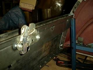 Under the gutter, a folded "L" section steel panel about 2.5" (65mm) high was made to stiffen the gutter section and also to mount the trunk lock. This is a small, compact lock from a Mazda and the release arm was extended so that a cable release can be fitted. A couple of tapped spacers were welded to the panel for mounting the lock. A piece of 3/4" (19mm) square tube in the centre, will take the thrust of the lock down to the floor, to add further rigidity to the panel. I need some form of "popper" also, as this lock has no spring release. Another item to be made! I also need to make a neat exit hole for the gutter drain and the sunroof from the body and a cover for the lock.