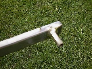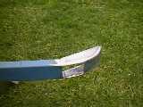 At the rear of an A model Ford coupe, there is a panel which is located under the trunk which runs across the bottom edge of the body, curving around to each fender on the sides. For some reason, this panel is often missing and my coupe body is no exception. Faced with this missing piece, I decided to make a close copy, based on 2x1" (50x25mm) steel tubing, bent to shape. I bent it by cutting slots in the rear with a hack saw and then curving the tube to be as close as possible to the shape of the body lower extremity. Not an easy task as I found out, as re-welding the saw cuts, results in "pulling" to make a more severe curve. Be warned! Weld only a little at a time, and let it cool down. The pics. below show an alternate light mount hole, since deleted. The ends were curved, using some shaped 3mm plate. I clamped another scrap tube to the "panel" to ensure the ends are fitted straight.