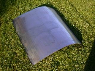 The skin was then carefully clamped to the frame and a 20mm edge bent over, all round, by carefully hammering the skin over the edge of the frame. A lot of distortion results on the curved edge (sides) sections and this area was shrunk using oxy/acet and a hammer and dolly while hot. Only about 50mm at a time was shrunk.