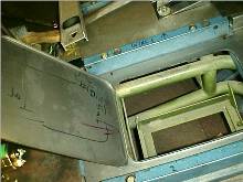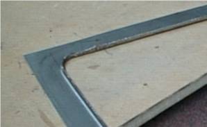 It's a fairly simple way of making a formed part but requires a little time spent making a pattern in MDF or similar wood. The size of the opening is cut into the wood, using rounded corners for preference. I used a jigsaw. Its important to make the lines as straight as possible, for a nice end result in the metal. Then the piece of steel sheet has a hole sut into it, a little smaller than the hole in the wood. I usually make it about 3-4mm. (about 3/8") Its not critical except in the corners where the less metal there is to fold over, the better, or you will get a lot of distortion as in this area, the metal has to be stretched.