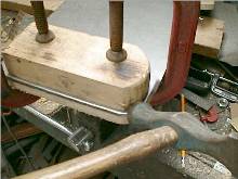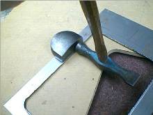 The picture shows the lid being formed on the corner. It takes a number of light blows, working around the corner, to get the metal to flow and fold over nicely. Note the wood on top, placed near the edge to prevent distortion as mentioned above.
