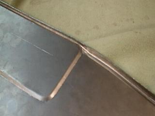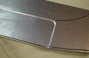 Here is the recess for the number plate. This was done on a stepped swaging roller, whilst the bottom edge either side has a rounded swage line. After the swages were done, about 3/8" was folded back, at right angles, using a hammer and dolley. This is to stiffen the bottom edge.