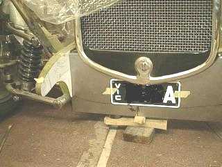 This is a mock-up of the style I am going to try. The sides conform more to the chassis rails and sweep down to the central section. We are supposed to fit a front number plate here in this state, so one is dummied in place. It will be recessed into the panel and the bottom edge of the panel cut along the black line and the edge folded under.