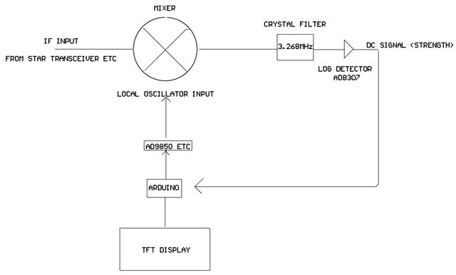 I happen to be be building a PICASTAR transceiver. (See Yahoo groups) So I thought of adding a Panadapter display for it. My thoughts are for the IF signal at 10.695Mhz to be buffered out to a point where, say, an old 10.7MHz 25Khz wide filter could be used. (I have since bought a couple of 10.7MHz, 35KHz wide, 8 pole filters on eBay for AUS$16. Perfect.) Mix this down to maybe 6MHz where cheap crystals are available for a filter to get 200Hz resolution. The filtered output signal can be measured by an AD8307 log detector (or use an FM IF chip with RSSI {signal strength} like the NE604, which is cheaper and easier to get) The local oscillator for the mix down to 6MHz could be done with a DDS controlled by a micro, which sweeps the DDS across the bandwidth of the crystal filter. The micro would convert the level from the log detector using its in-built analogue to digital convertor and then display it on the graphics display.