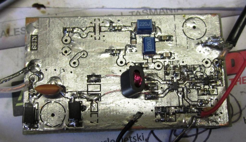 I had to fit a leaded J310, until an SMD one becomes available. Its on the left side of the picture. The other two transistors (BFR92) are SMD parts. The output LPF and attenuator stage is not yet fitted. This PCB is about 1.6" * 0.75".