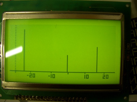 I wrote a quick bit of code to try it out. This represents several signals either side of the centre frequency. At the bottom is a scale with centre frequency and +- 10, 20KHz. This is not the final version. Since there are 128 dots across and 64 down, I have allocated a section to the left (dotted line) of 8 dots across for a scale (not there yet) of signal strength with the bottom 8 dots vertically, being the frequency offset.