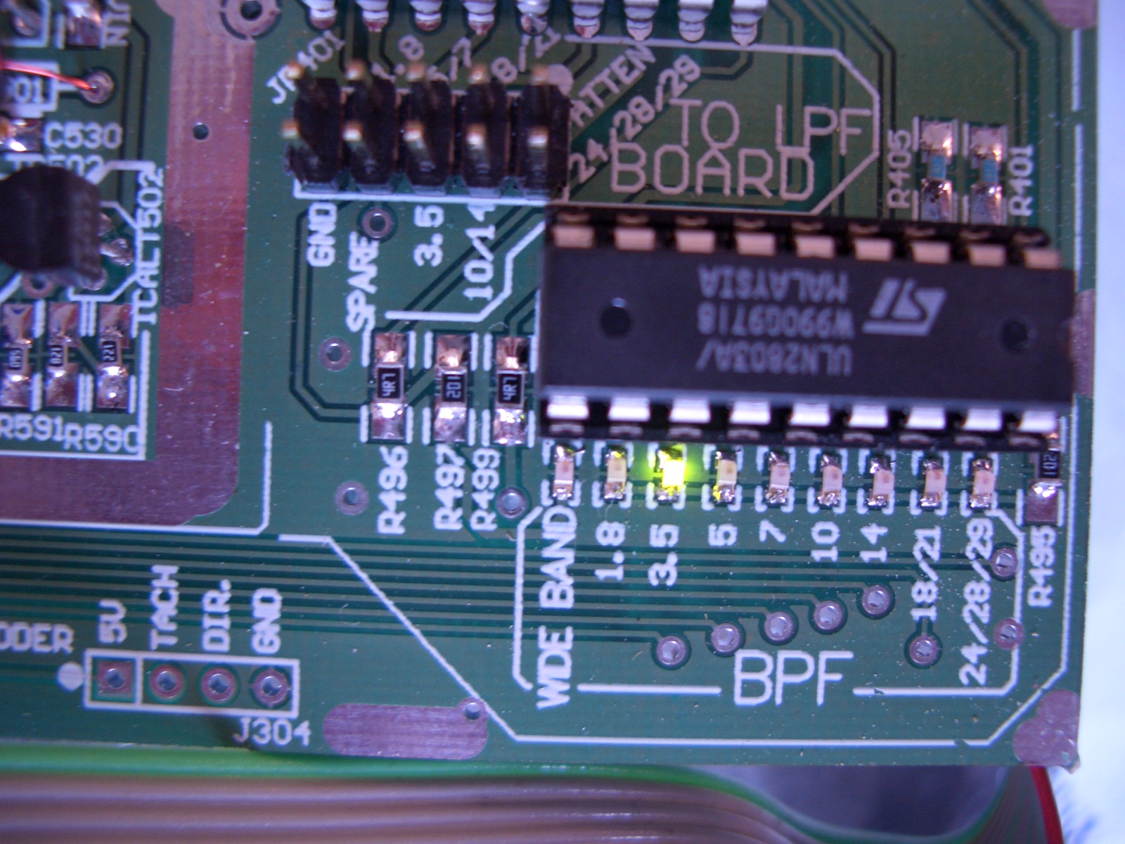 Below: There are some aids to know what is happening on the PCB. eg. a series of SMD LED's show the current band selected. The 10 pin header above the LED's connects to the Low pass Filter.