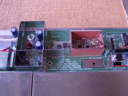 24th March, 2009: Start to fit shielding. I used 0.4mm tin plate bought from RS Components. The DDS section has PCB material for insulation as per the original PICaSTAR design. The shielding in that area is not yet finished. Strips of the tinplate form the walls with the covers having the edge folded over for a tight fit, hopefully RF proof! Click on pictures for a larger view. Underneath, shields will also be fitted.