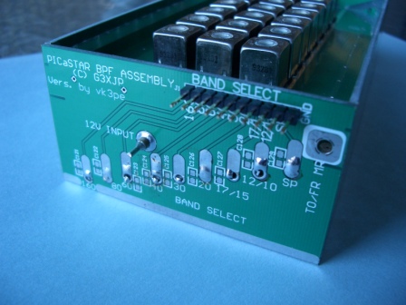 I have been unable to measure the actual isolation in the "off" mode due to lack of facilities but on my tracking gen/spectrum analyser, it looks good so far. (>80dB which is limit of my set-up) Of course I am still to check and align all the other bands and will do so when more time is available. It draws approx. 13mA from a 12v supply. When testing, make sure only 5v logic is used to enable each band. (see note further down also, to avoid possible damage to one or more of the FST devices !)
