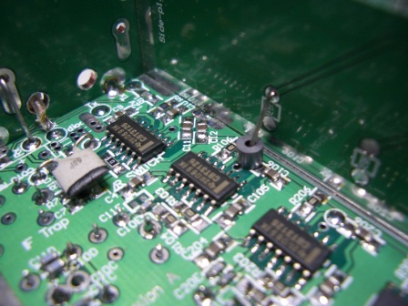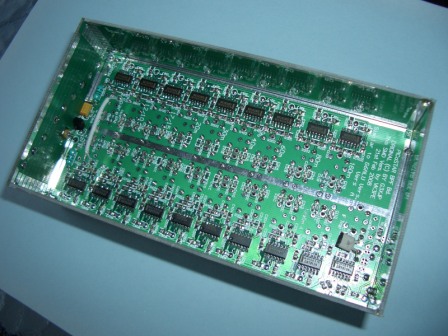 The central shield which will run down the centre of the main PCB is also not fitted, while testing. This shield solders to the strip which can be seen on the PCB and then makes contact with the bottom cover. (Not fitted also). Refer to the G3XJP original drawings for details of the shielding.