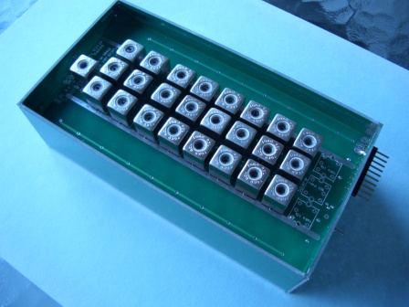 Also, the bottom is not fitted. The bottom is not supplied with the PCB panel. A double sided piece of blank PCB material is cut oversize with allowance for mounting holes, and is then soldered to the bottom edges when all alignment is completed. The "busbars" on this version are tracks on the PCB with through holes to the FST3126's on the other side.
