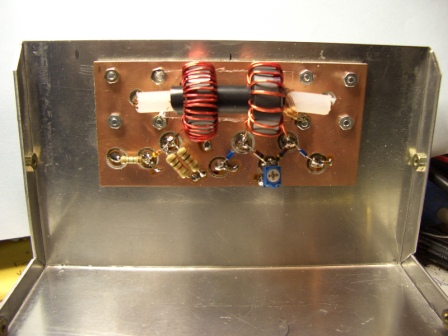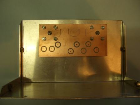 In the spirit of DIY, a home brew case was made from some aluminium sheet in three parts, front, base/rear and top cover. There are very few parts in the project and the original used a piece of PCB material with little round pieces of PCB stuck to it, to form isolated points for mounting the parts. I have an old spot weld removal tool and it removes a nice round circle to isolate a "pad". This was used and the circuit was quickly built. The "nuts" in the sides are thin sheet fasteners or root nuts. Found in a box at a Ham rally. It pays to look in all the boxes !!
