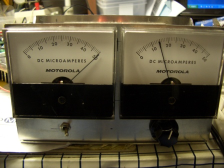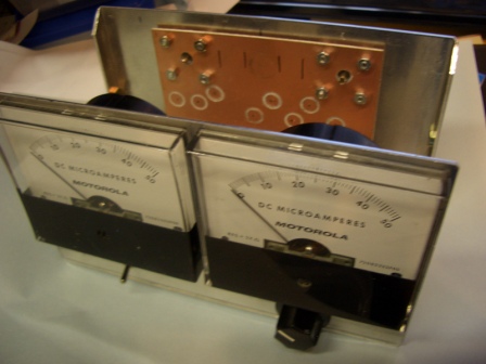 To the right is the finished meter. I may scale the meters later. I used some special semi-gloss grey sheet with adhesive rear to make a lable on a laser printer and gave the case a coat of grey paint from a spray can.