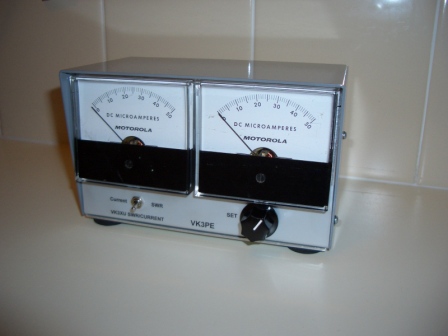 The SWR section on the right follows conventional practice and uses BAT46 diodes. A switch is used to select either the SWR or current mode on the right hand meter. Two SO239 sockets are mounted on the rear.