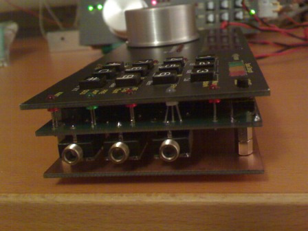"DSC00084.JPG" My two PnM front assemblies seen from both sides with front panel and keyboard removed. I put pretty much everything on one board with components on both sides, i.e. PnM, status, and Picswr. Therefore three 3.5mm jacks that connects to the PC can be seen. I kept all serial buses at TTL levels on the board to avoid the MAX232 and its switching voltage converter. Instead I use a "USB to TTL cable" from FTDI. The picswr pic was not yet mounted when the picture was taken as can be seen on the lower board.