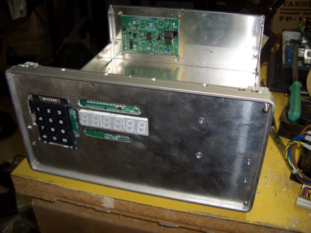The case I am using is an old test instrument, bought at a sale for $10. I stripped out all the interior (saving some of the "goodies") and made a new chassis for it. Plus a rear panel which I am mounting the PA onto. A large clearance hole in the rear panel allows the PA and heatsink to be removed from the rear of the radio. There are tapped bushes inserted into the rear panel, so no nuts are needed. You can see PnM also. There will be another panel fitted over the front, held in place by screws in the corners.