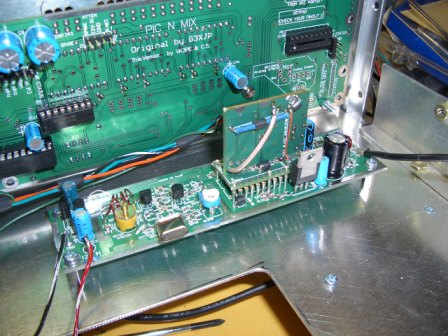 Temporary wiring only here. Crystal (25MHz) yet to be finally fitted and PCB housing for the Butler to be made and fitted. The DDS Filter board is on the other side of the chassis to the right. A hole has to be drilled in the chassis to pass the co-ax cable through. The 5v regulator for the DDS will need a small heatsink.