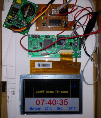 This is my setup, above. Top left is a little PCB with a real time clock (RTC) on it. To the right is the 9S08QG8 Micro built on proto perf board. Just the micro and a 78L05 voltage regulator. It has 8kb of flash memory, plenty for this project. In the middle is the TftA pcb and below is the 4.3" Tft display from a Sony PSP1000 handheld playstation. As you can see, I have drawn a few lines, some text, and implemented a clock using the RTC pcb (from Futurlec). The Tft and the RTC are connected using the serial I2C lines. (ie data and clock) The RTC is read and the date and time etc are extracted from it in BCD format then re-formatted into text to display on the TFT in the bottom half. This is only the tip of the iceberg on what can be done. Just up to our imagination really, what can be displayed. vk3pe TftA Build information:- Known problems None Bill of materials (BOM) Schematic Software Integration Refer to Yahoo "TftA_Central" group, files section. VK3PE's "Manual" for TftA PCB v2.2 This "manual" is for the assembly and commissioning of the TftA PCB v2.2 Last update on June 3, 2010 At end of page, 5" display types clarified June 2, 2010 Added font load screen pictures May 27, 2010 removed D2 in table at end. Overlay by value updated. May 24th, added information on alternate programmer May 15th, 2010: corrected fonts name and location Please note, this is a draft procedure written by VK3PE. Some of the documents below are by VK3PE. It is NOT the official build procedure, but was derived from two builds by VK3PE. What you need for this project:- 1) A suitable TFT display of 480x272, either