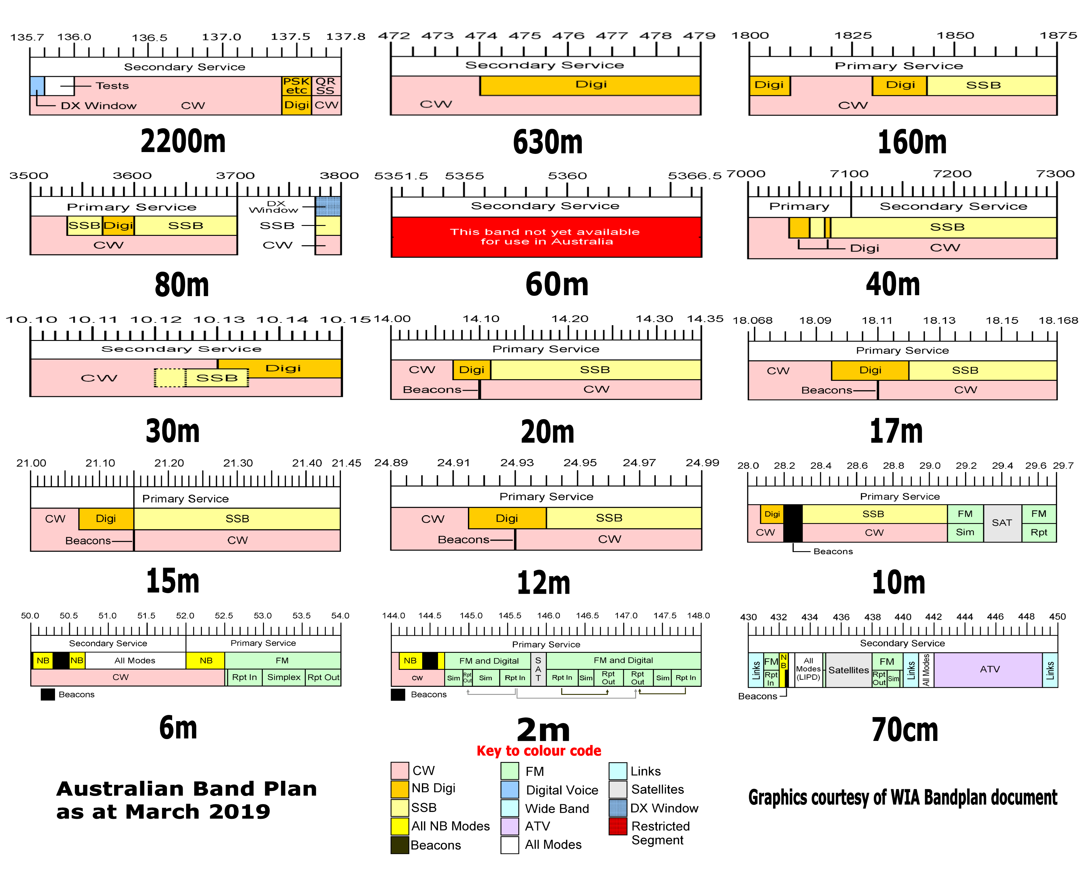 Here is a sheet I made up from the WIA's Australian band plan information, current as of March 2019.