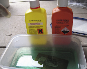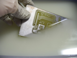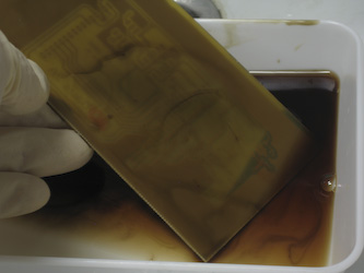 3: Die Platine wird in den Entwikler(blau) gelegt. Dieser entfernt nur