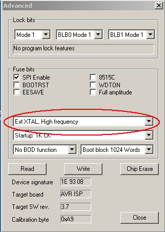 - 'stk500.ebn' auswählen und die Fuses passend setzen (ext. high frequency crystal, nur Mega8535. siehe Bild unten)